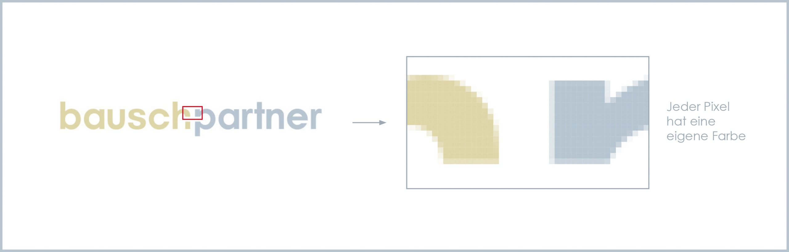 Eine scharfe Kante fehlt bei Pixelbildern. Sie bestehen aus einzelnen „Würfelchen“, die aus der Entfernung gesehen ein Bild ergeben. Jedes Pixel hat eine Farbe und eine feste Größe, die sich nicht verändert.