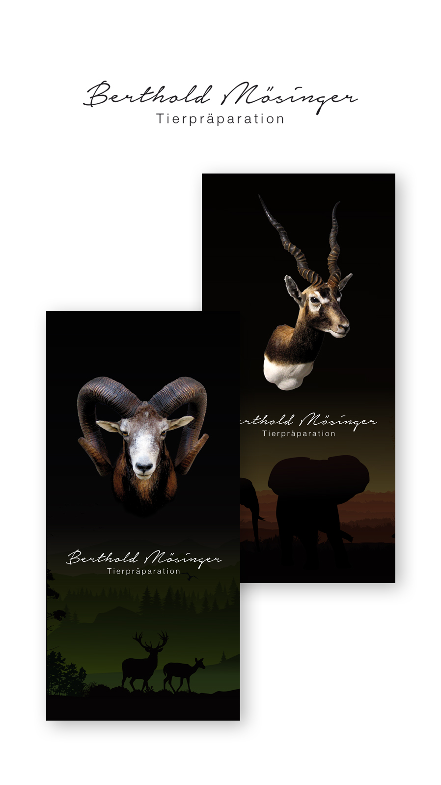 Erstellung zweier Werbefolder: Präparation europäischer Trophäen und derjenigen von Auslandsjagden.