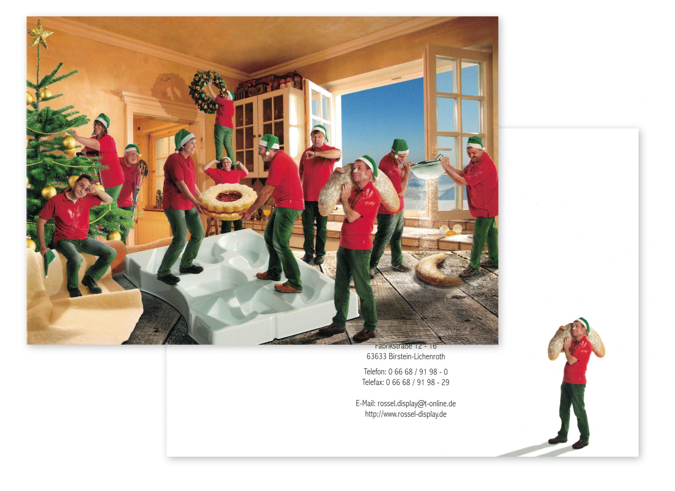Eine Weihnachskarte sollte alle Mitarbeiter abbilden. Der Hauptaspekt der Arbeit bestand aus einem Layout für das fertige Bild, einem Fotoshooting aller Mitarbeiter in entsprechender Pose und der anschließenden Bildbearbeitung.